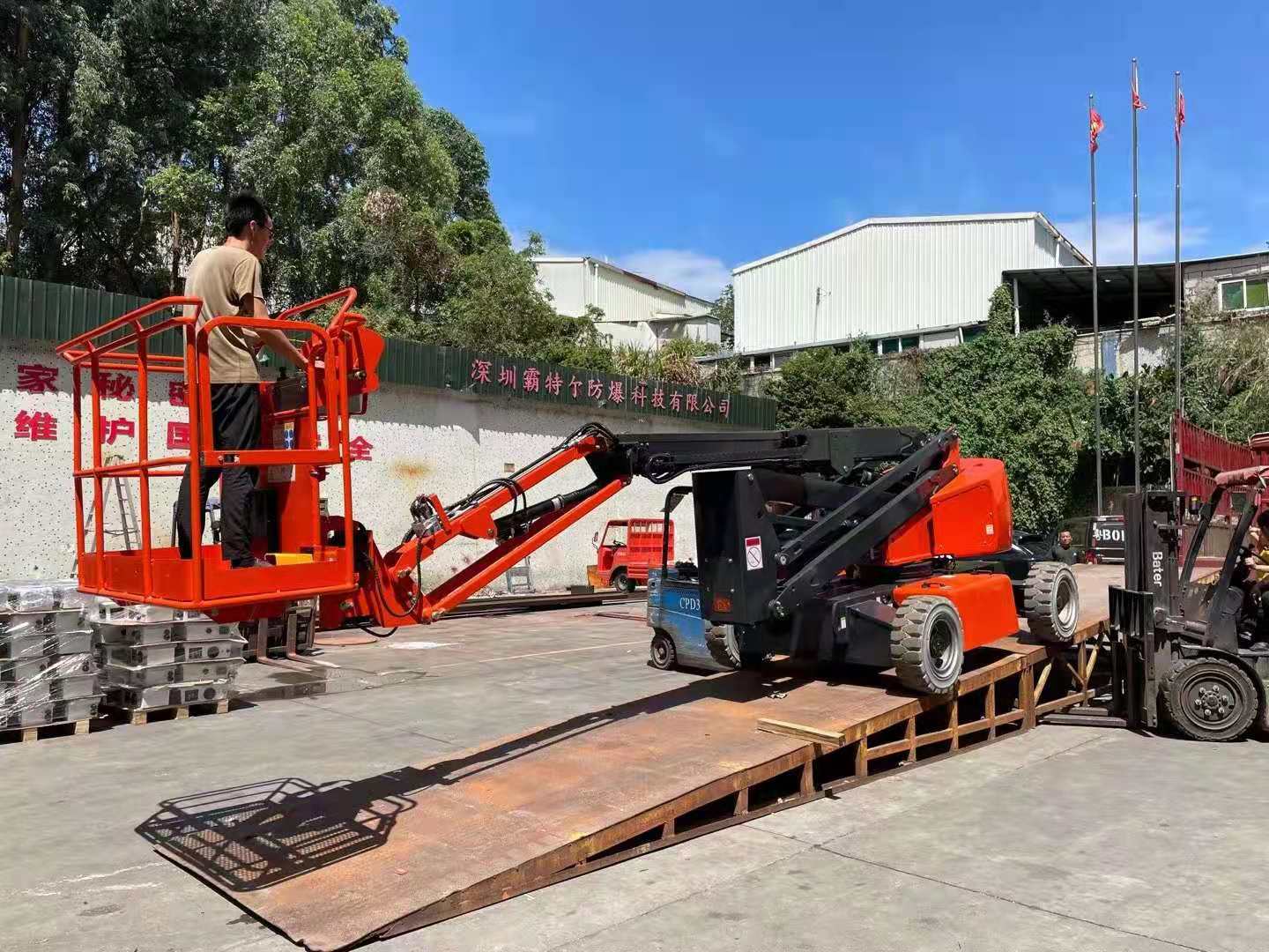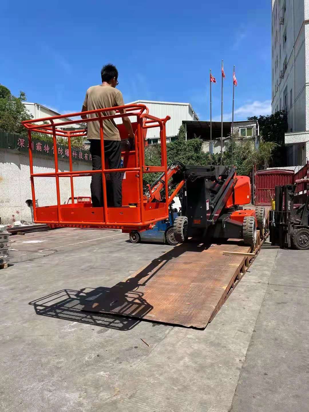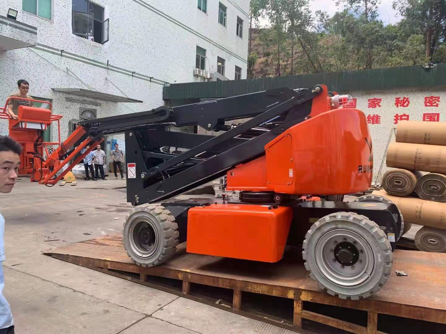 倉(cāng)庫(kù)、品質(zhì),準(zhǔn)備曲臂平臺(tái)出車資料準(zhǔn)備出貨,相關(guān)人員廣場(chǎng)上協(xié)助整理曲臂車擦干凈準(zhǔn)備出貨。