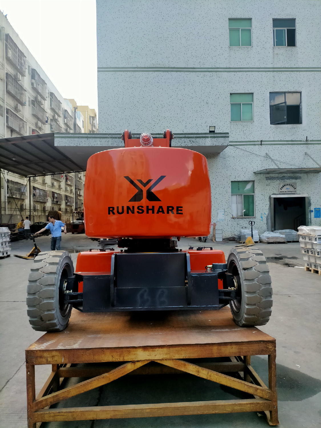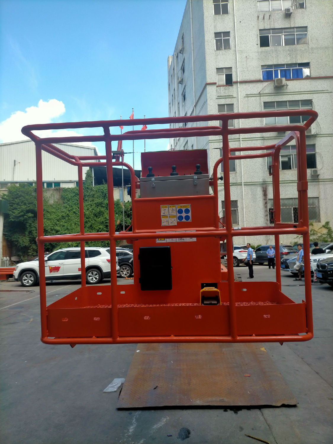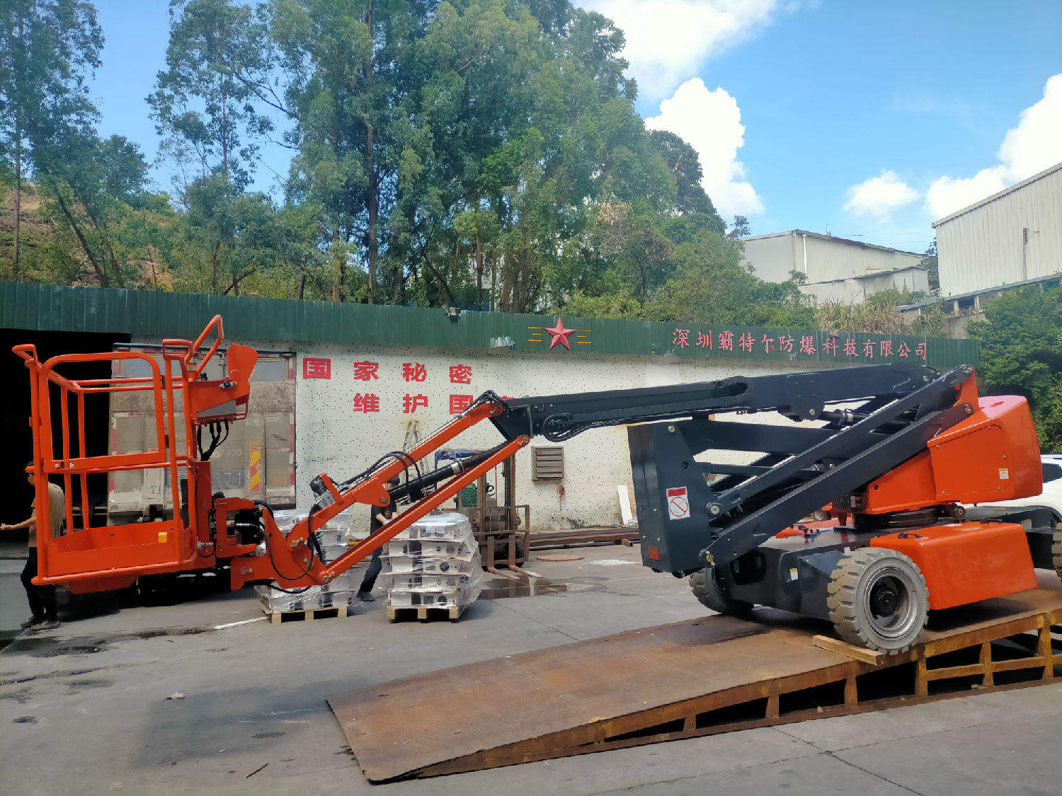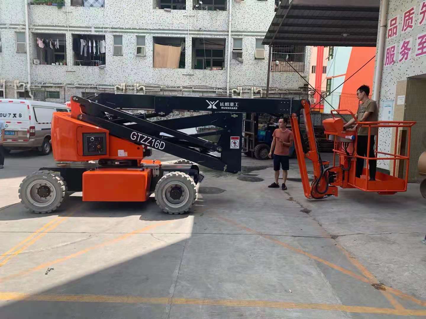 倉(cāng)庫(kù)、品質(zhì),準(zhǔn)備曲臂平臺(tái)出車資料準(zhǔn)備出貨,相關(guān)人員廣場(chǎng)上協(xié)助整理曲臂車擦干凈準(zhǔn)備出貨。